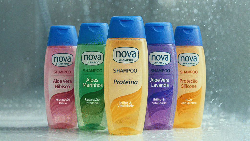 Projeto de embalagem para Nova Cosmética: frascos e rótulos que combinam impacto visual, funcionalidade e linguagem alinhada ao público-alvo.